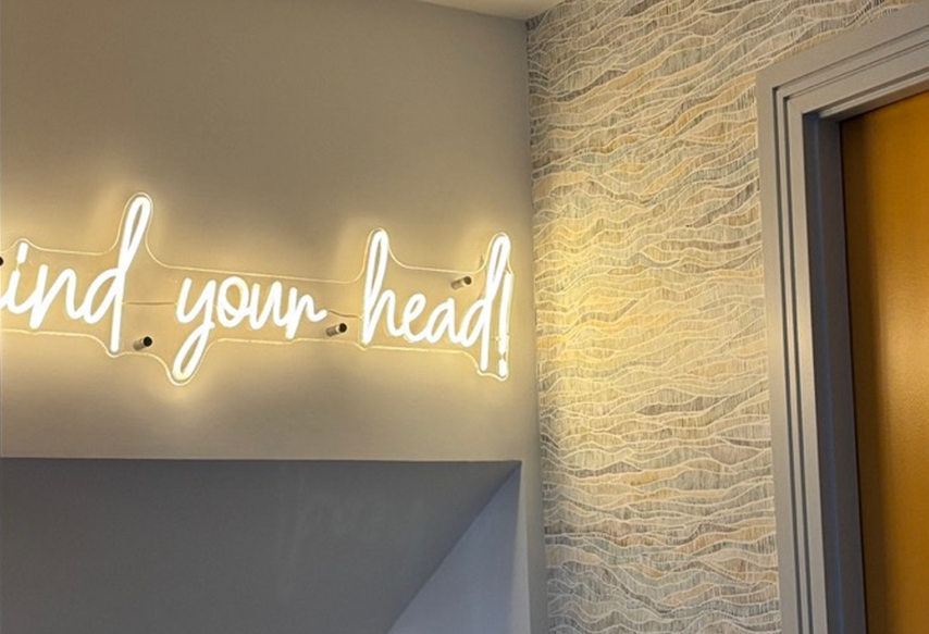 The house was rewired throughout. Additional touches included bespoke lighting cord to complement the client's colour scheme and a neon-inspired sign over the lower stairs